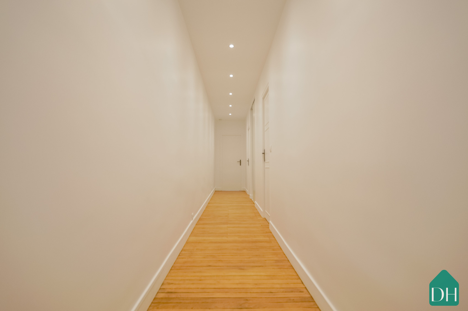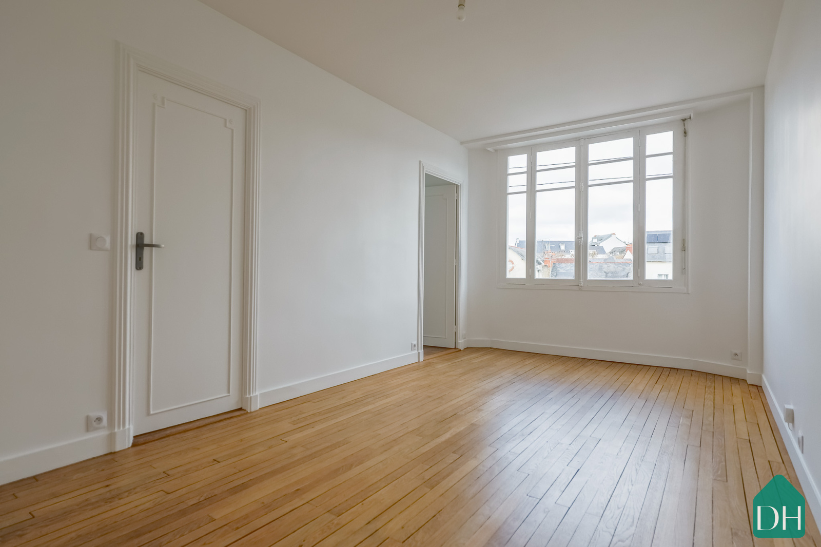 Parquet bois massif rénové, volumes élégants, grands ouvrants