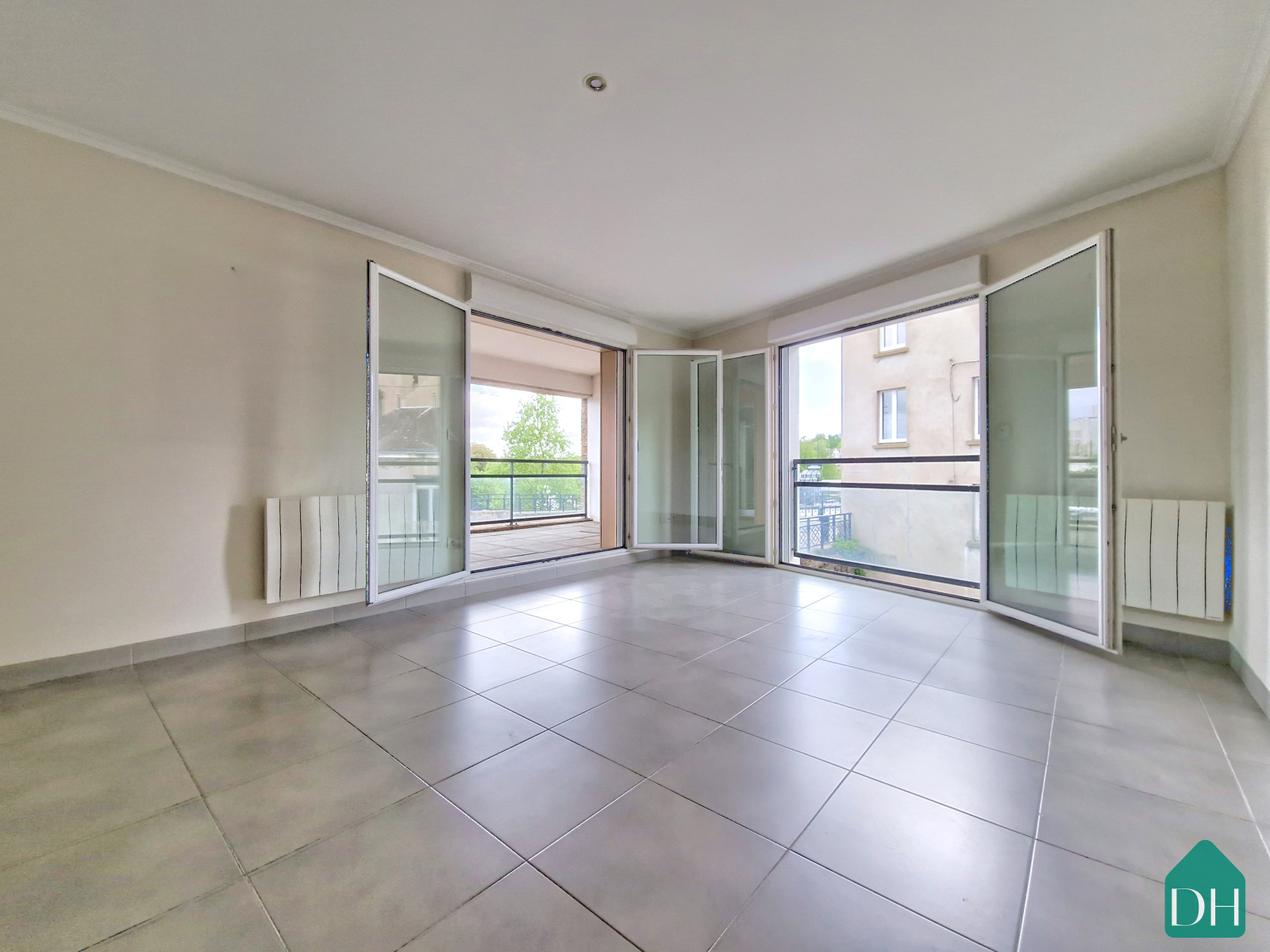 Un salon lumineux avec de larges ouvertures donnant sur une terrasse privée, ensoleillée et tournée vers l’Erdre