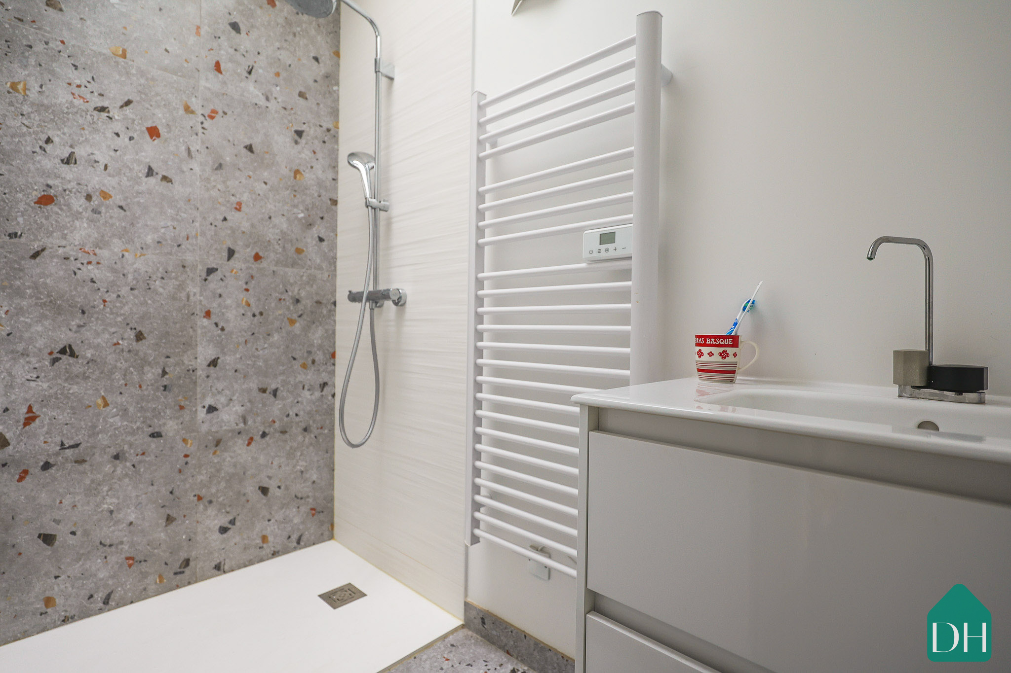 Le rez-de-chaussée accueille également une buanderie, un WC indépendant, ainsi qu’une superbe salle d’eau avec douche à l’italienne et puits de lumière (motorisé), apportant confort et élégance au quotidien.