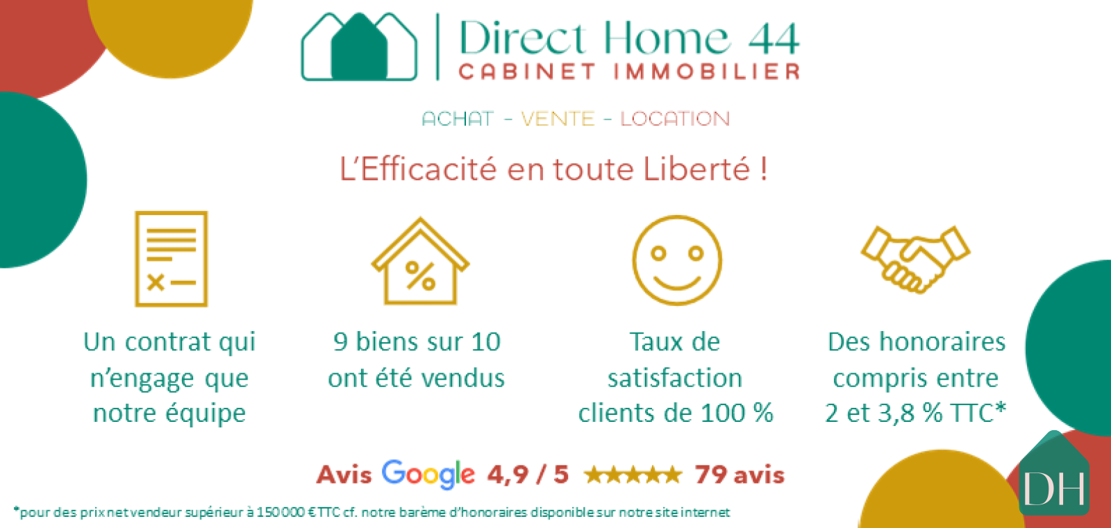 Ce bien a trouvé preneurs grâce à votre cabinet Direct Home 44 ! Vous souhaitez être accompagné dans l'estimation & la vente ou l'achat de votre bien immobilier à frais réduits (3,8%)? Contactez nous au 02 51 02 15 35 ou par mail contact@directhome44.com
