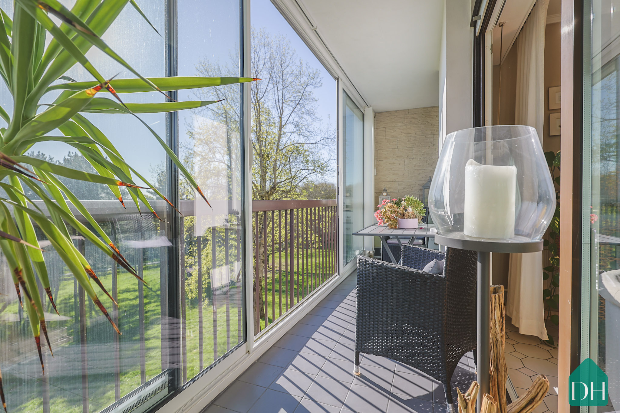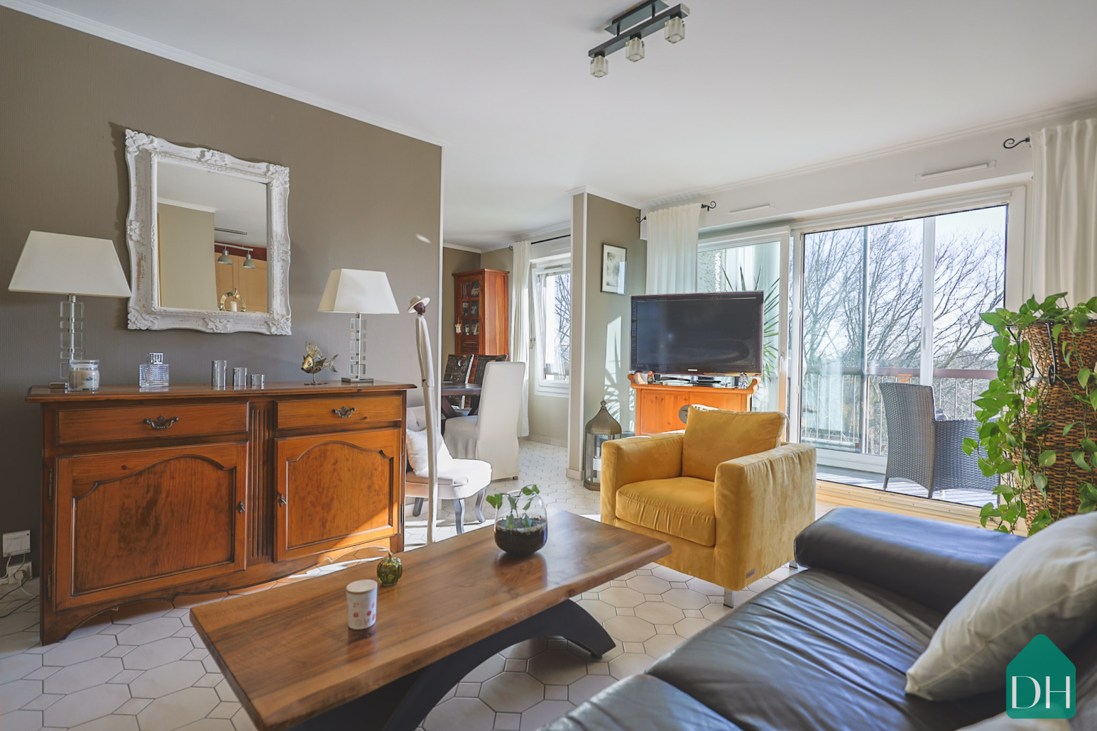 La pièce de vie, lumineuse et ouverte, se prolonge naturellement par une loggia exposée sud-ouest.