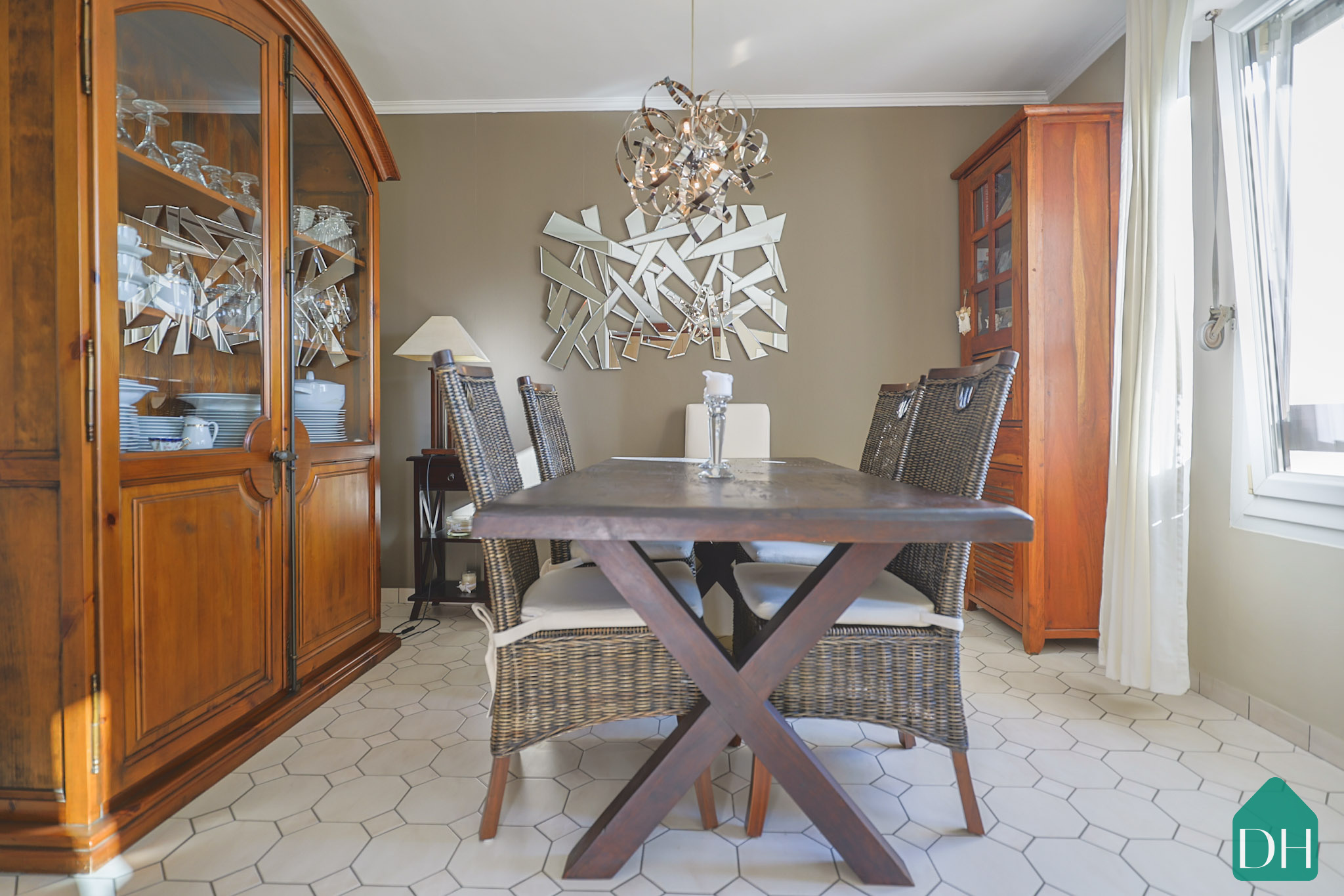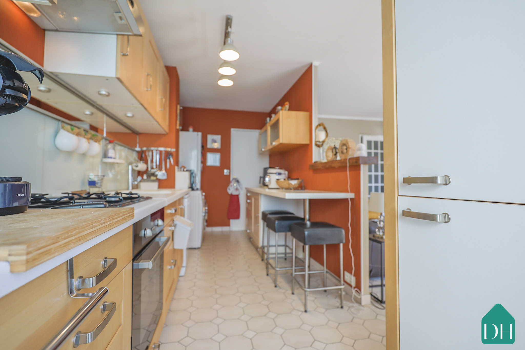 La cuisine semi-ouverte, aménagée et équipée, s’intègre avec élégance et fonctionnalité à l’ensemble.
